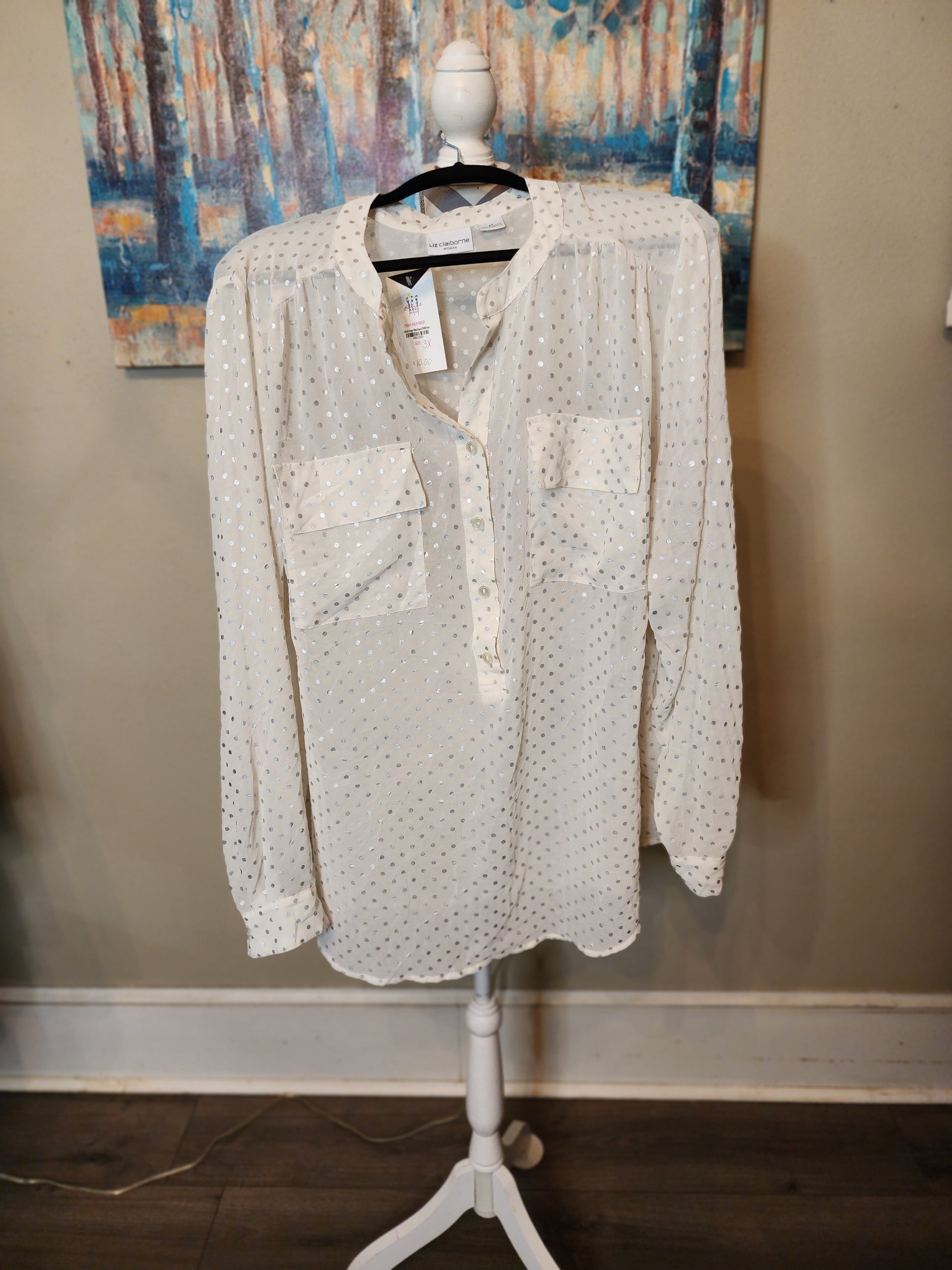 Liz Claiborne Woman Whit Sheer Blouse with Silver Polka Dots